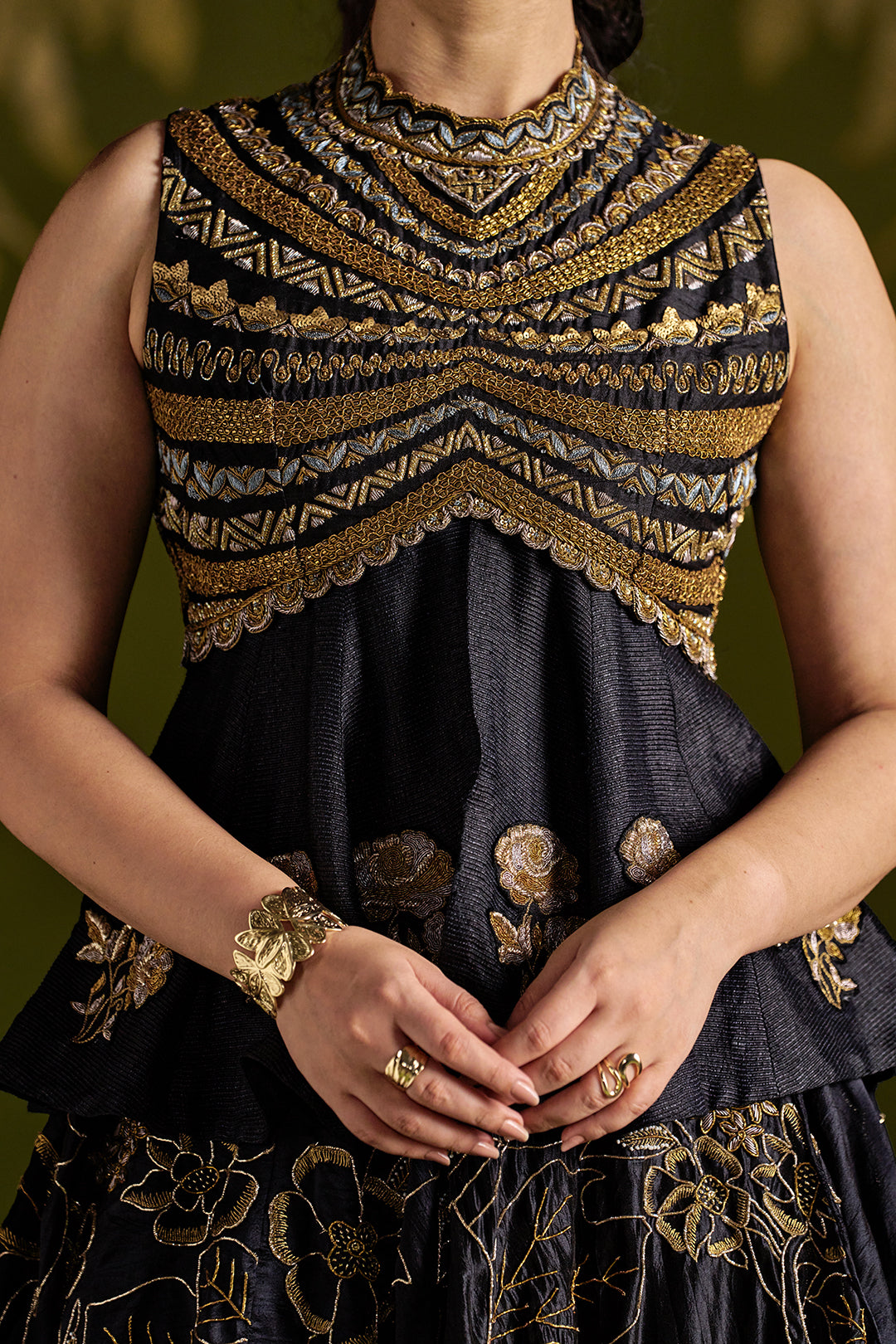 This set includes a sleeveless handmade tussar peplum top with heavily embroidered high neck and yoke featuring dense geometric and floral antique embroidery, paired with a voluminous silk lehenga adorned with all-over intricate floral embroidery in black. The ensemble is a masterpiece of couture craftsmanship with exquisite aari, zardosi, and cutdana work in antique gold cascading from the neckline through the yoke and across the lehenga in sweeping floral trails.